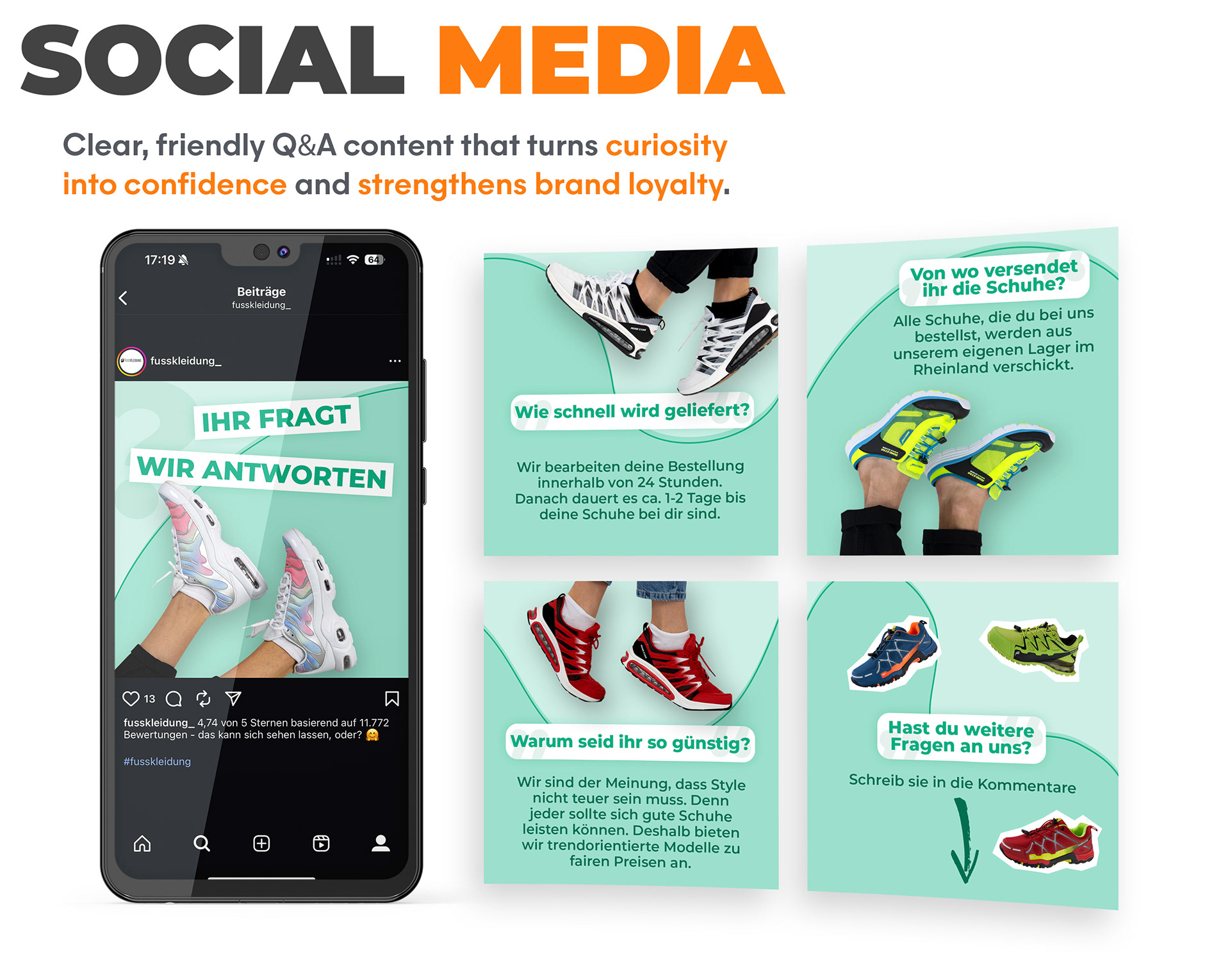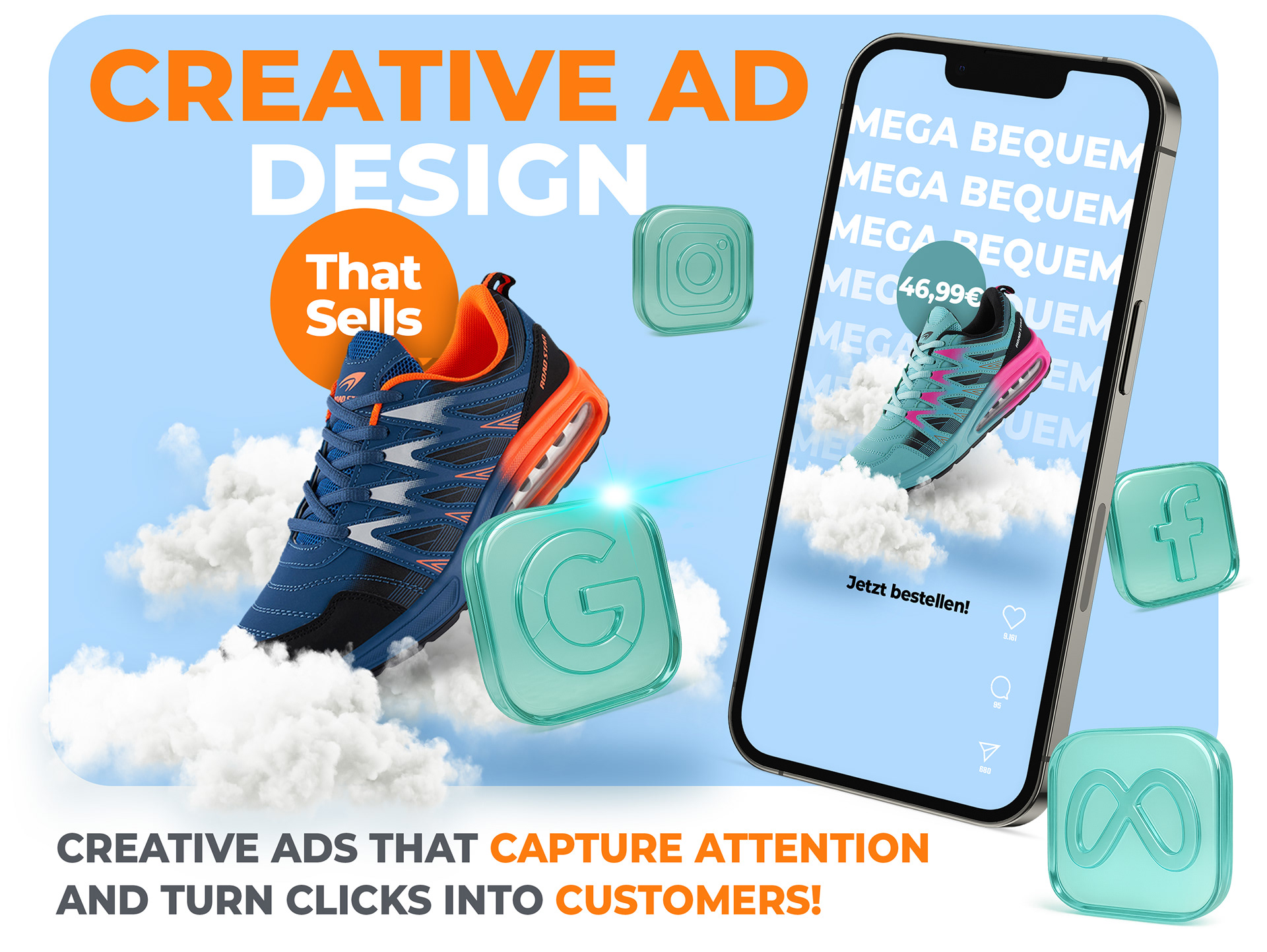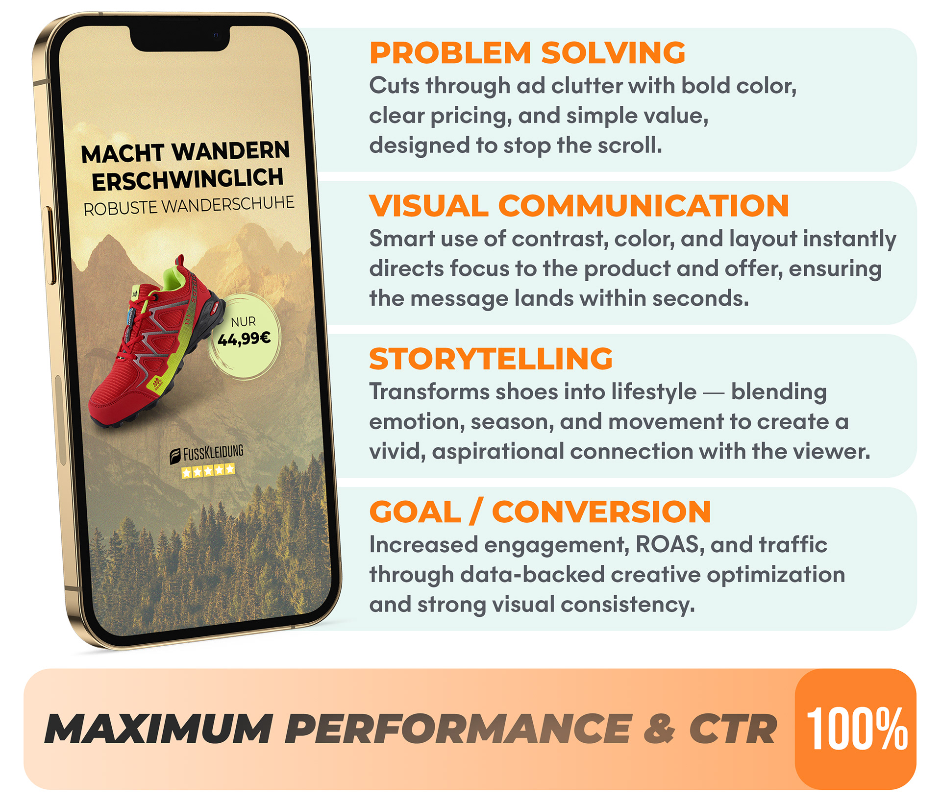 This project showcases a full series of high-performance creative ads designed for the footwear brand Fusskleidung. The visuals focus on conversion-driven design, strong product storytelling, and scroll-stopping layouts optimized for Meta, Google, and Amazon. Through static ads, motion creatives, and social content, the campaign establishes a consistent visual system that boosts CTR, engagement, and purchase intent. A clean mix of color, clarity, and emotion turns each ad into a high-impact performance asset.